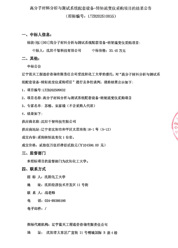 高分子材料分析与测试系统配套设备-转矩流变仪采购项目结果公告